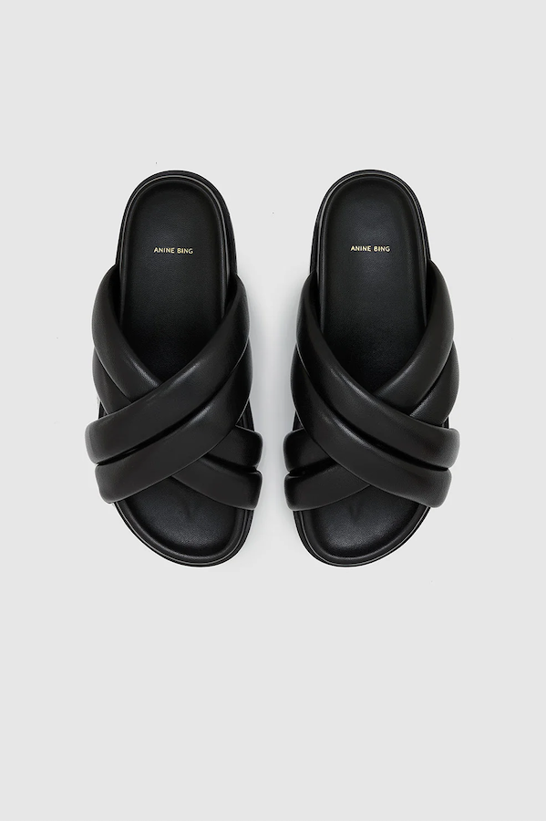 A best-selling pair of flat sandals with puffy cross-over straps and a padded sole constructed from smooth lambskin leather. The Lizzie Slides come accented with a gold-tone ANINE BING monogram at the outer portion of both heels, serving as a discrete touch of signature branding.