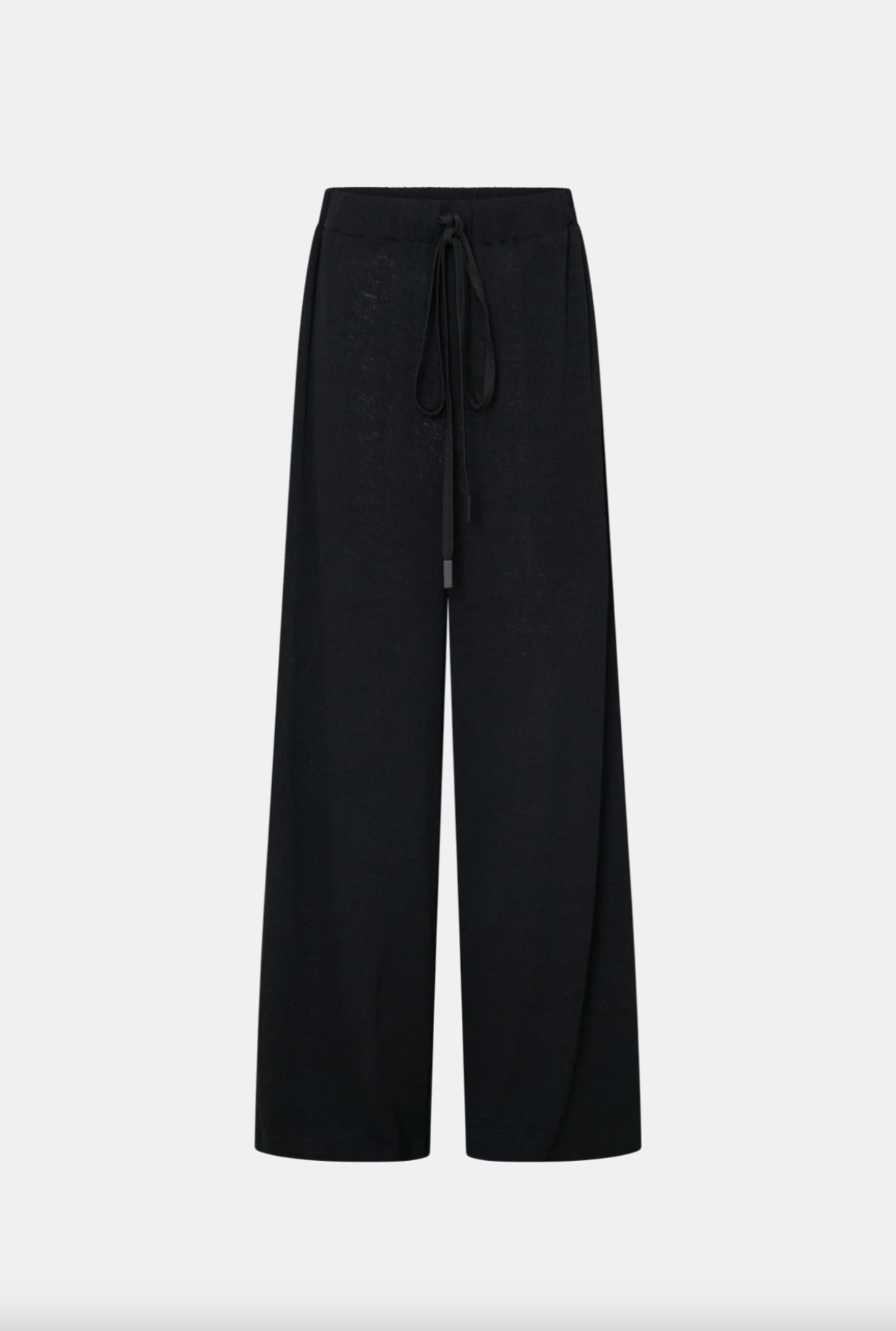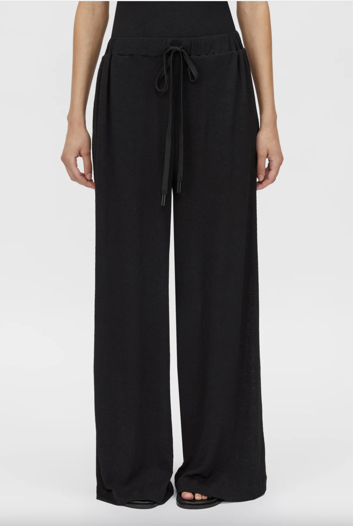 CAMILLA AND MARC Cali textured crepe mid-rise lounge pant in chocolate black. Elasticated waistband and internal drawcord for a relaxed fit. Inseam pockets.