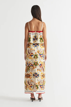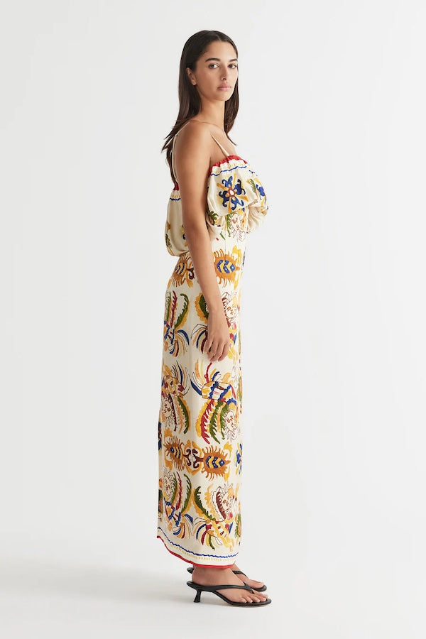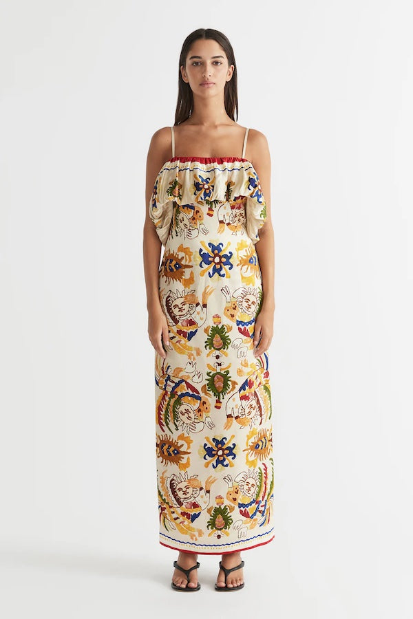 A must-have piece for the Spring Summer ‘24 season, the Dancer Frill Neckline Gown by Antipodean pays homage to enchanting new territories. Artfully charmed with an air of sophistication, the dress features an original in-house placement print, hand-drawn by our founder. Crafted from an elegant silk linen fabrication, the flattering waist detail accentuates your silhouette gracefully while the bubble frill adds a layer of sartorial drama. Complete with a centre-back zip entry and high back vent for ease of wear and movement, adjustable thin straps for a customized fit, and fully lined for comfort.
