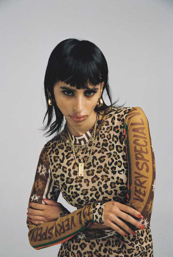 Very Geo Leopard Mash Up Mesh Mini dress with allover leopard print & our top selling "Very Geo" print on sleeves, collar & hem.