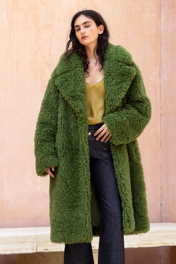 This coat wraps the silhouette in a generous, plush volume, thanks to its soft boucle-effect texture.