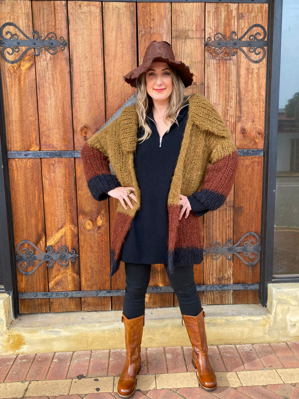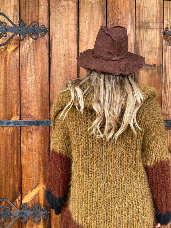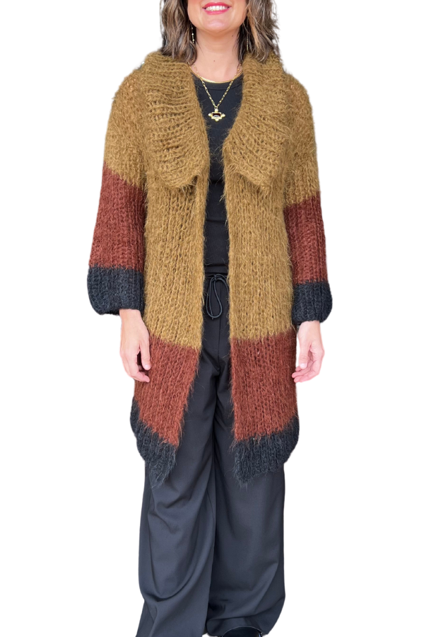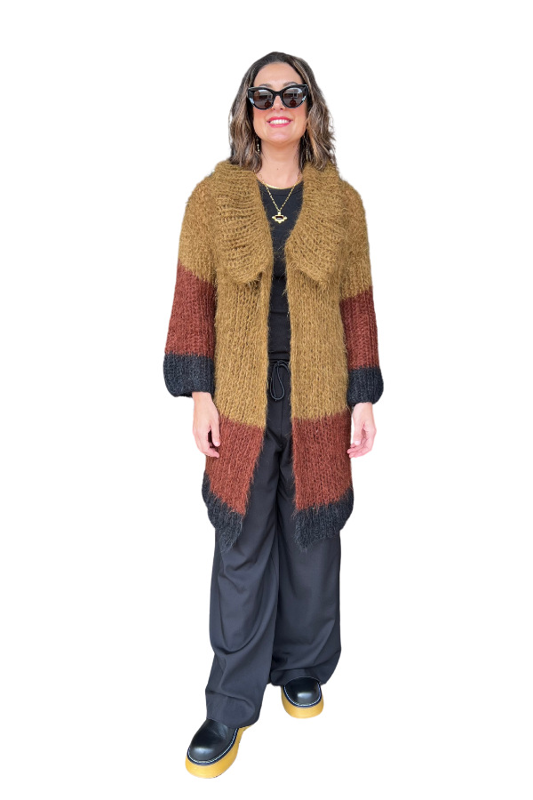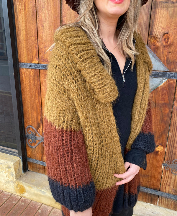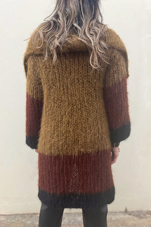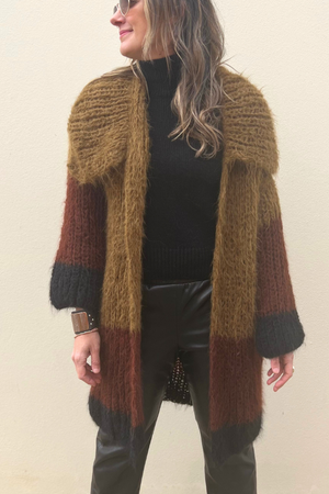 The Amano suri alpaca shawl collar cardigan is handcrafted with old fashion knitting kneedles. Featuring a shawl collar and wide bell sleeves. Handmade locally from the softest suri alpaca wool.