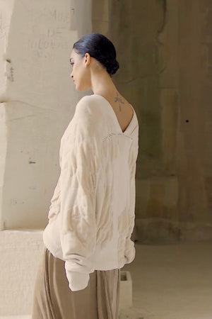 It has a double V-neckline and is punctuated by slightly transparent seams.