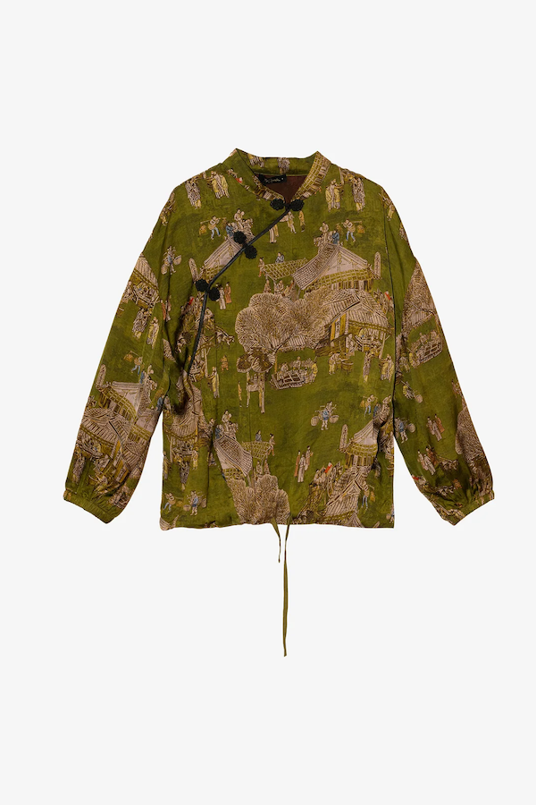 An exotic and refined piece, crafted from olive green viscose jacquard adorned with a detailed print of a traditional Asian scene in earthy tones. Its relaxed fit is structured by a stand-up collar and asymmetrical black toggle fastenings, giving it an elegant, Mao-inspired look.