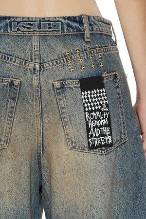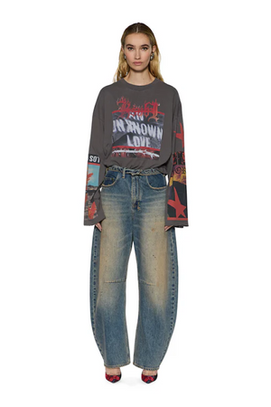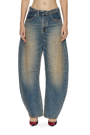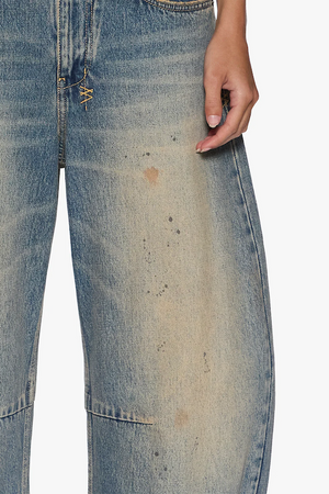 The Barrel Jean Dune is a mid-rise, relaxed fit jean with a distinctive barrel-shaped leg that tapers at the ankle. Made from premium indigo denim, this style features a heavy tinted wash with contrast fading on high-wear areas and subtle oil blotches, giving it an authentic worn-in look. Design details include a fold-down flipped waistband with Ksubi embossed branding. Finished with classic five-pocket styling, Ksubi branded hardware, T-box and 3x4 embroidery, and a removable pocket tag attached to the wearer's right back pocket.