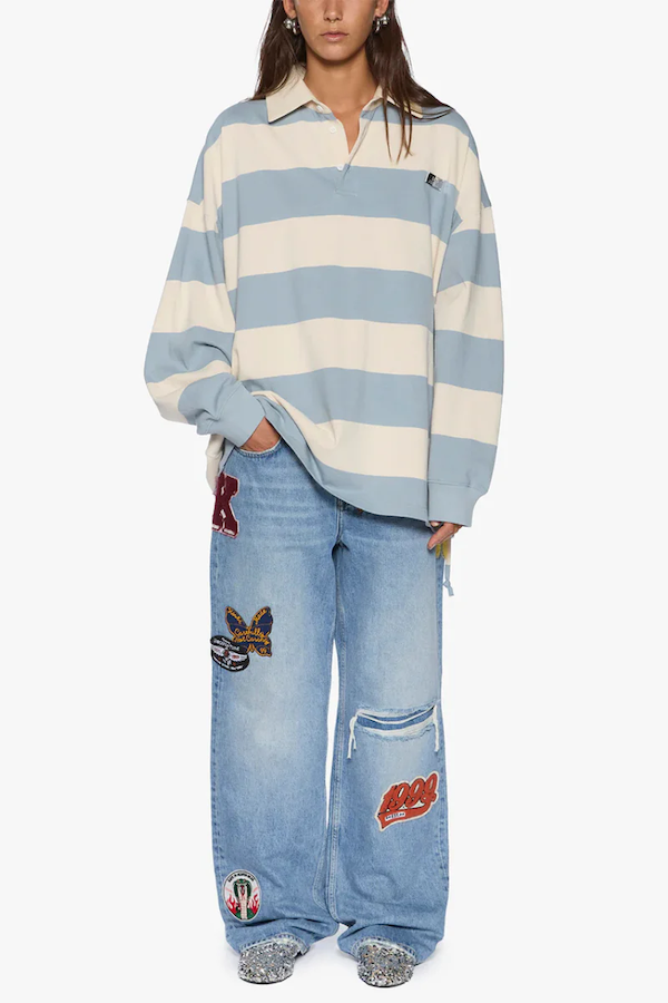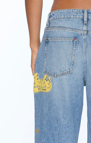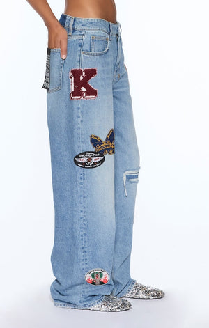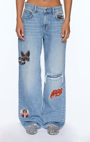 The Low Rider Horizon Patch is a low-rise relaxed straight leg jean crafted from premium European rigid denim in a mid-blue wash. It features vintage wear details, rip-and-repair patching, red contrast accents, varsity-style boucle patches, and signature Ksubi T-box, 3x4 branding and removable back pocket tag.