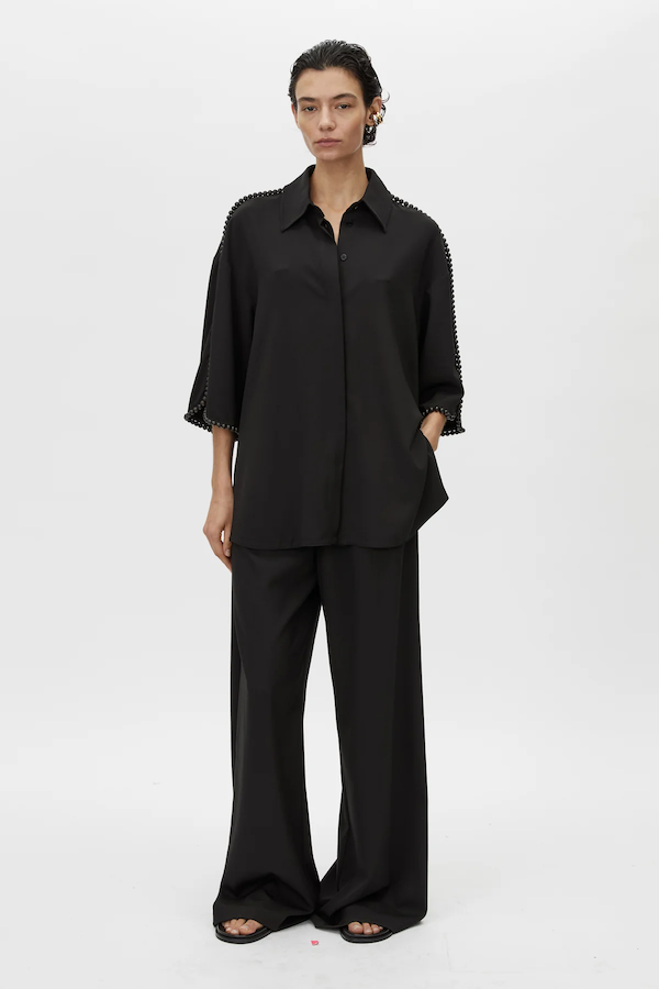 CAMILLA AND MARC Trevi black short-sleeve shirt with wooden hand beaded detail. Concealed button placket, corozo button, side seam splits.