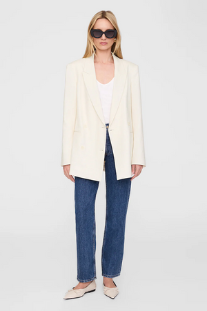 A constructed blazer made from a midweight, textured suiting fabrication, featuring a classic fit, peaked collar, and double-breasted, four-button closure.