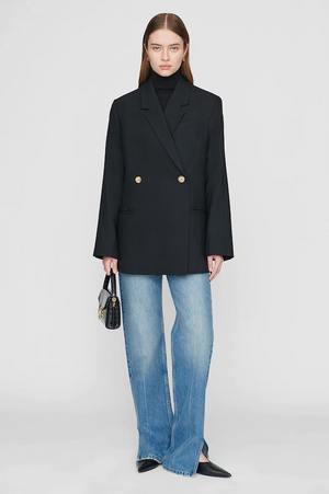 The relaxed and oversized Kaia Blazer in a classic wool blend. It's fully lined and includes internal shoulder pads, a wide double-breasted front closure, one welt pocket at the wearer's left chest, one interior chest pocket, and two welt pockets at the hips.