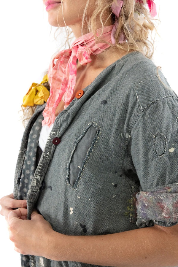 Yarn Dyed Cotton Leni Jacket, Hand Fading, and Distressing, Mixed Patches and Buttons, Grandmother Print Lining