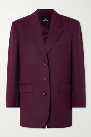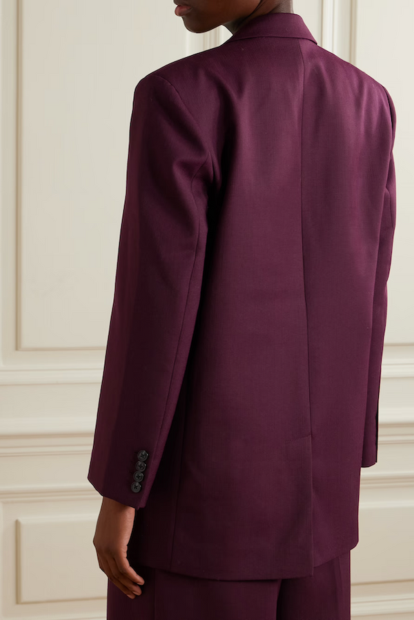 The Sara Blazer is constructed from a lightweight wool blend with a drapey yet structured look. Its elongated, oversized silhouette is fully lined and features constructed shoulder pads, a single-breasted closure with three buttons, one welt pocket at the wearer's left chest, two interior chest pockets, and two flap pockets at the hips. Finished with a center-back vent.