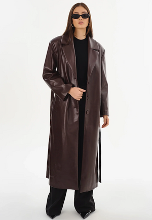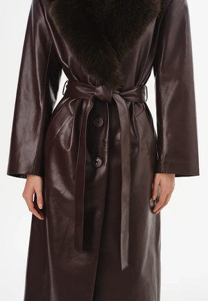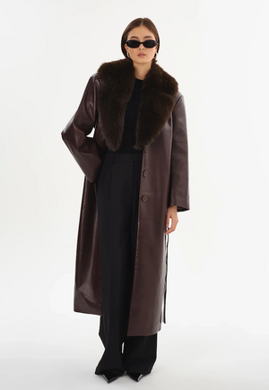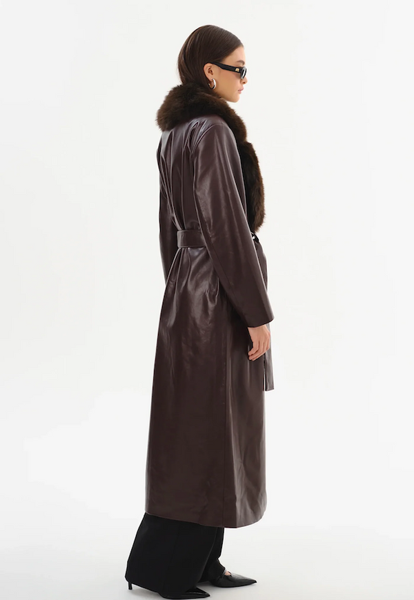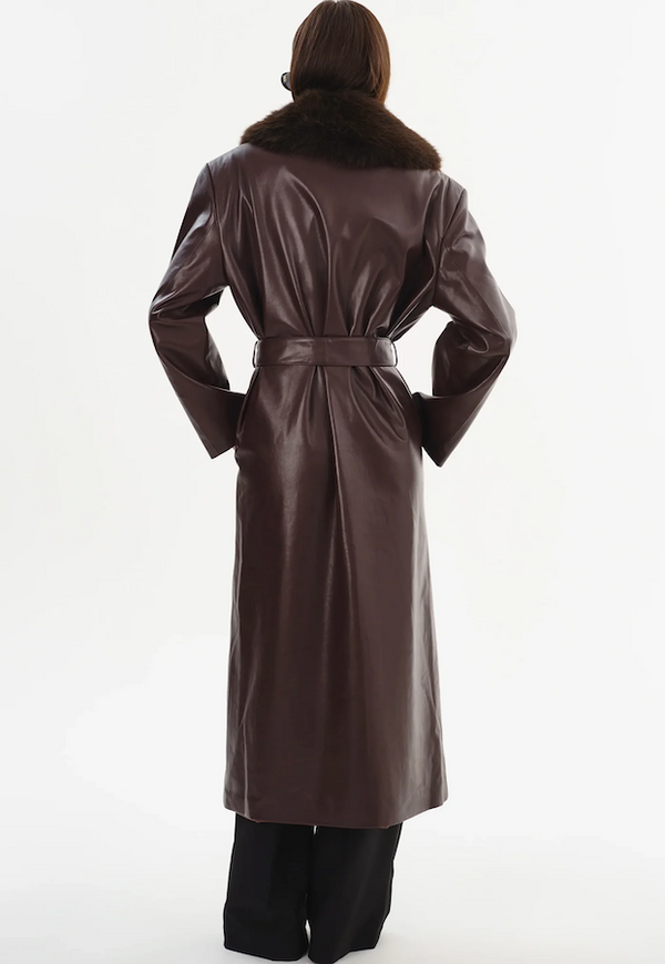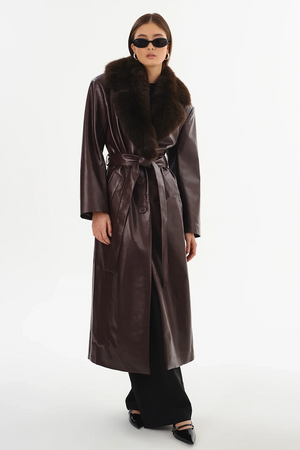 Elevate your winter outerwear with the SARITA Recycled Leather Maxi Coat. Crafted from recycled leather and featuring a detachable faux fur collar, this coat brings a touch of luxury to the holiday season. With its structured fit and belted waist, it's perfect for making a grand entrance at any festive gathering.