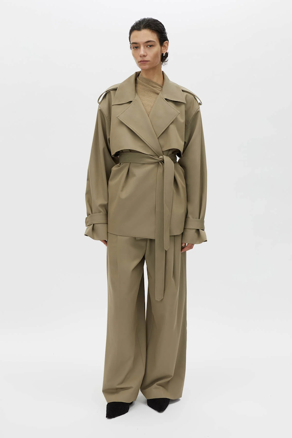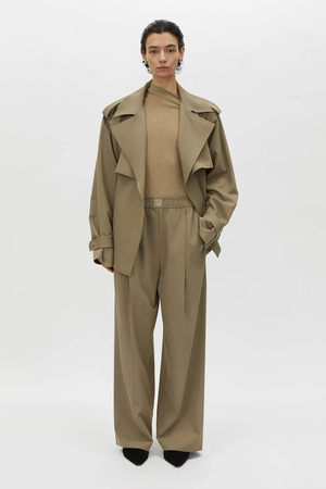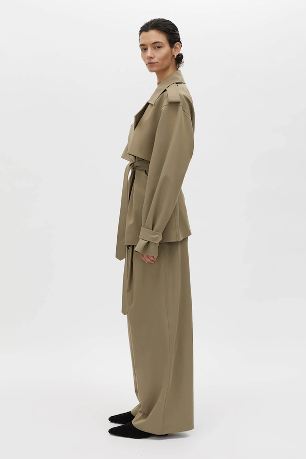 The Zeno Jacket is a refined, modern piece crafted from soft suiting fabric, featuring a funnel neck and concealed snap closure for a streamlined finish. Designed with practical self-fabric epaulettes, storm flaps, and in-seam side pockets, it offers both form and function. The self-fabric tie belt and twin needle top stitching complete this elevated jacket with an attention to detail that exudes precision.