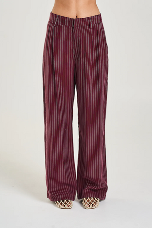 The Kina Pinstripe Boss pant is a relaxed suit pant crafted from a luxuriously soft cupro and viscose blend, designed with pleated darts, practical pockets, and a belt band for added versatility.