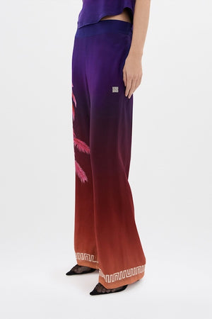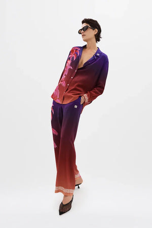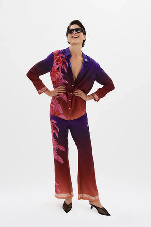 The Midnight Bias-cut pants feature the elegant Havana Dawn gradien, transitioning from deep magentas to a midnight navy. The pants have a loose, flowing silhouette that drapes beautifully to the ankles offering both comfort and sophistication. A weighted geometric embroidery detailing also matches the cuffs of the matching shirt, and together with vibrant pink cuban leaves a continuation of the story, they create a cohesive, eye-catching look. This co-ordinated set whether paired together or contrasted with other stories, is perfect for making a bold, stylish statement with a luxurious tropical cuban flair.