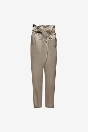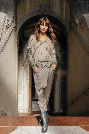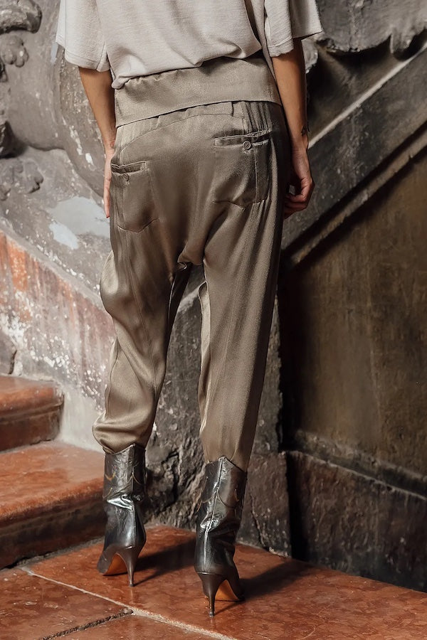A timeless shape for these harem pants in kaki viscose satin which emanates a sparkling delicacy.