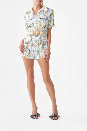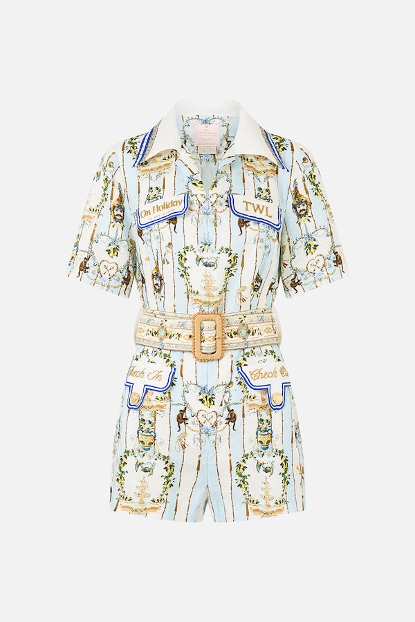 Designed in Australia, The Venus On A Vespa Pocket Playsuit exudes placid blue skies amid ornate archways and gilded borders, a collection reimagining intricate illustrations by Lezio Lopez. Lovingly handcrafted, this pocket playsuit offers functional charm. A zip front, flap pockets, and a removable self-covered belt are elevated by shimmering crystal embellishments.