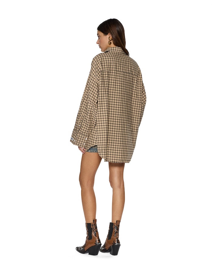 The Astra Ls Shirt Tan Plaid is an oversized button-up shirt made from premium European 100% organic cotton in a tan plaid colourway. Featuring a patch pocket, curved hem, classic center front collar and exaggerated cuffs, it's finished with a 'SOTT' woven label on the cuff and Ksubi T-box embroidery. Style back with any Ksubi denim for an off-duty elevated look.