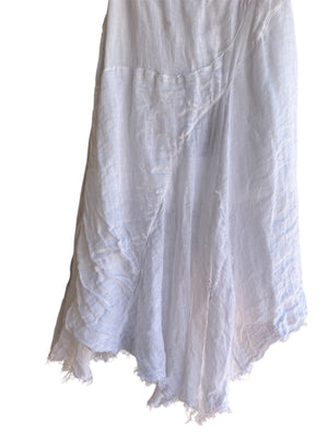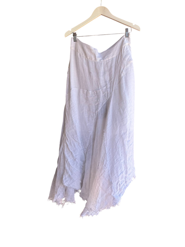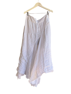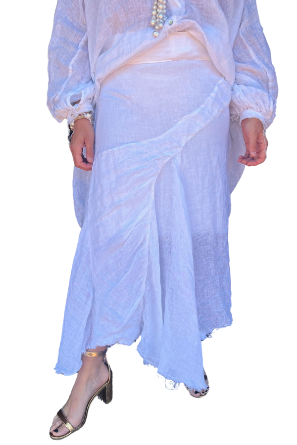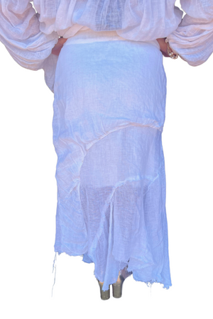 The hourglass skirt has built in godet panels with exposed raw seams and gathers on an uneven hemline. side zip and elasticated waistline for a perfect fit and comfort.