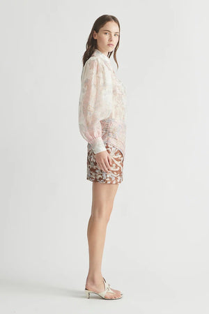 Embrace art centric style with the Bitter Sweet Tuck Mini Skirt by Antipodean. This high waisted mini skirt features an original in house print, hand drawn by our founder and perfectly placed on luxurious silk linen organza. The design boasts a crossover front and back with elegant tucks and gathering at the side seam for added texture. Fully lined for comfort, it’s finished with an invisible side seam zipper for a seamless look. Think of it as the piece that effortlessly elevates your wardrobe.