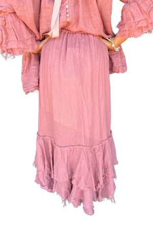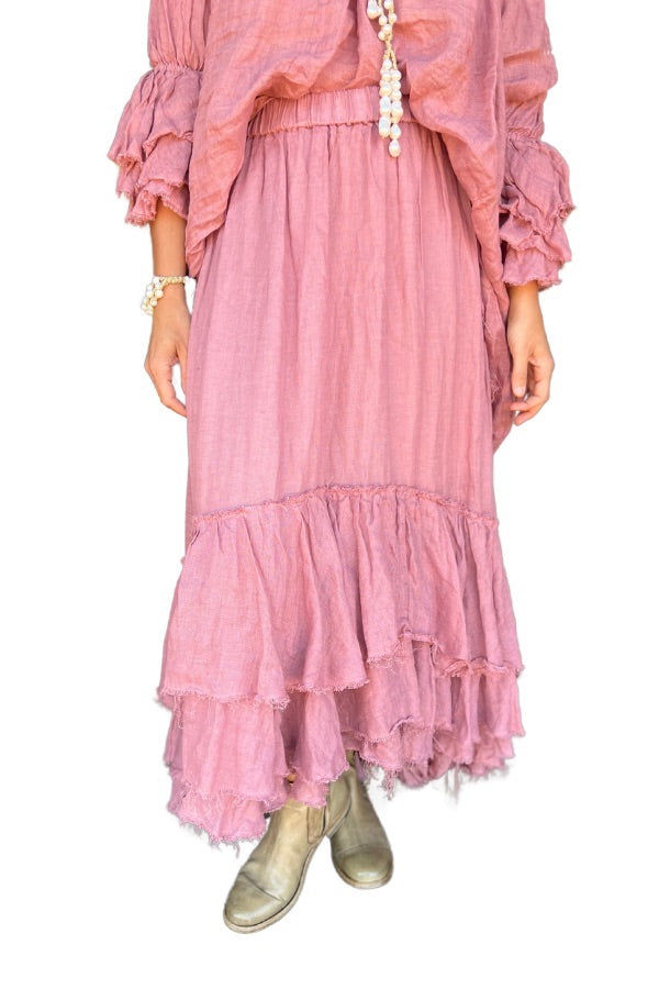 The Amano swan skirt has an elasticated waistband around waistline, to position around hips or waist. Featuring flounces around hemline and side pockets with a high low hemline and raw edge.