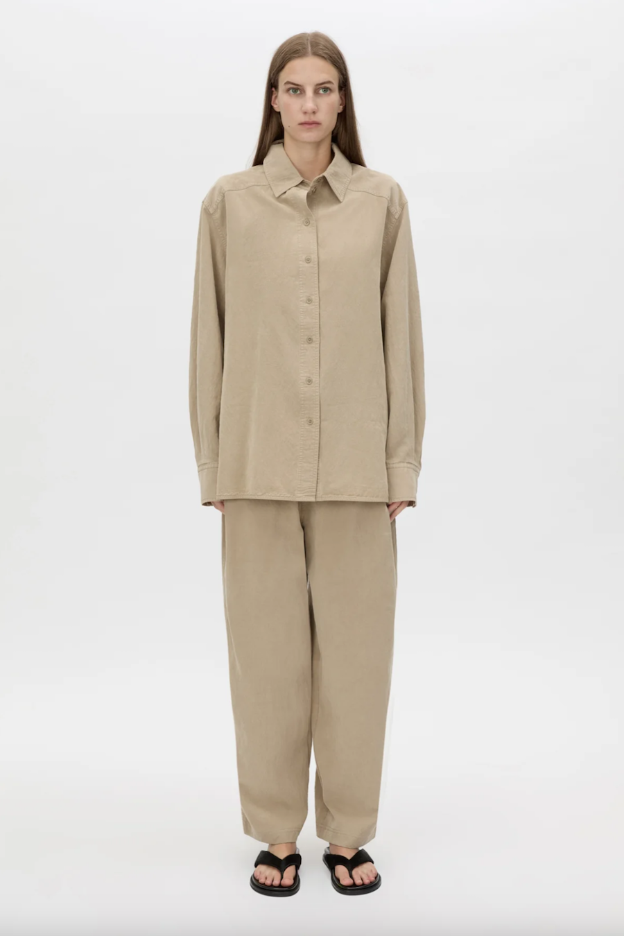CAMILLA AND MARC Adakite collared brown oversized shirt with corozo buttons. Long sleeves, side splits, classic collar.