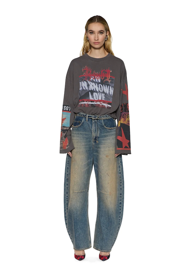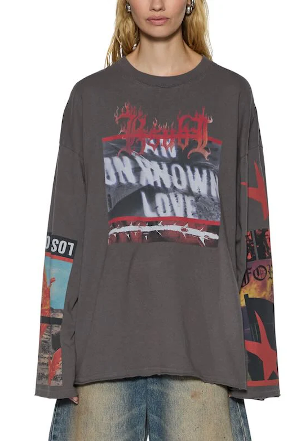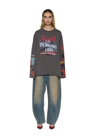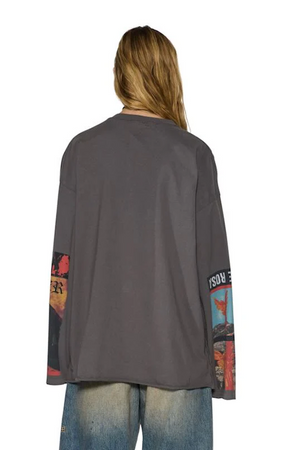 The Altar Ls Boyfriend Tee Charcoal is a boxy, oversized long-sleeve t-shirt featuring dropped shoulders and a full-length fit for a relaxed silhouette. Crafted from premium heavyweight cotton jersey in a 'Charcoal' colorway with an aged wash, it offers a vintage-inspired hand feel. Design details include a raw-cut back hem, reversed overlocked side seams, and sliced hems for a deconstructed touch. It features exclusive seasonal Ksubi graphics, inspired by a vintage 'Talking Heads' band poster, with irregular placements on the sleeves and front chest. Finished with signature T-box embroidery.