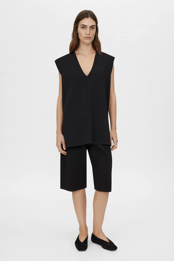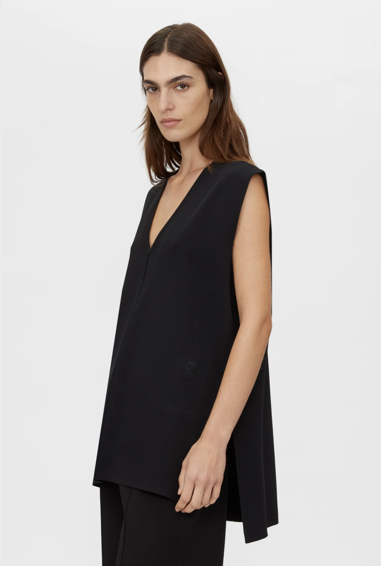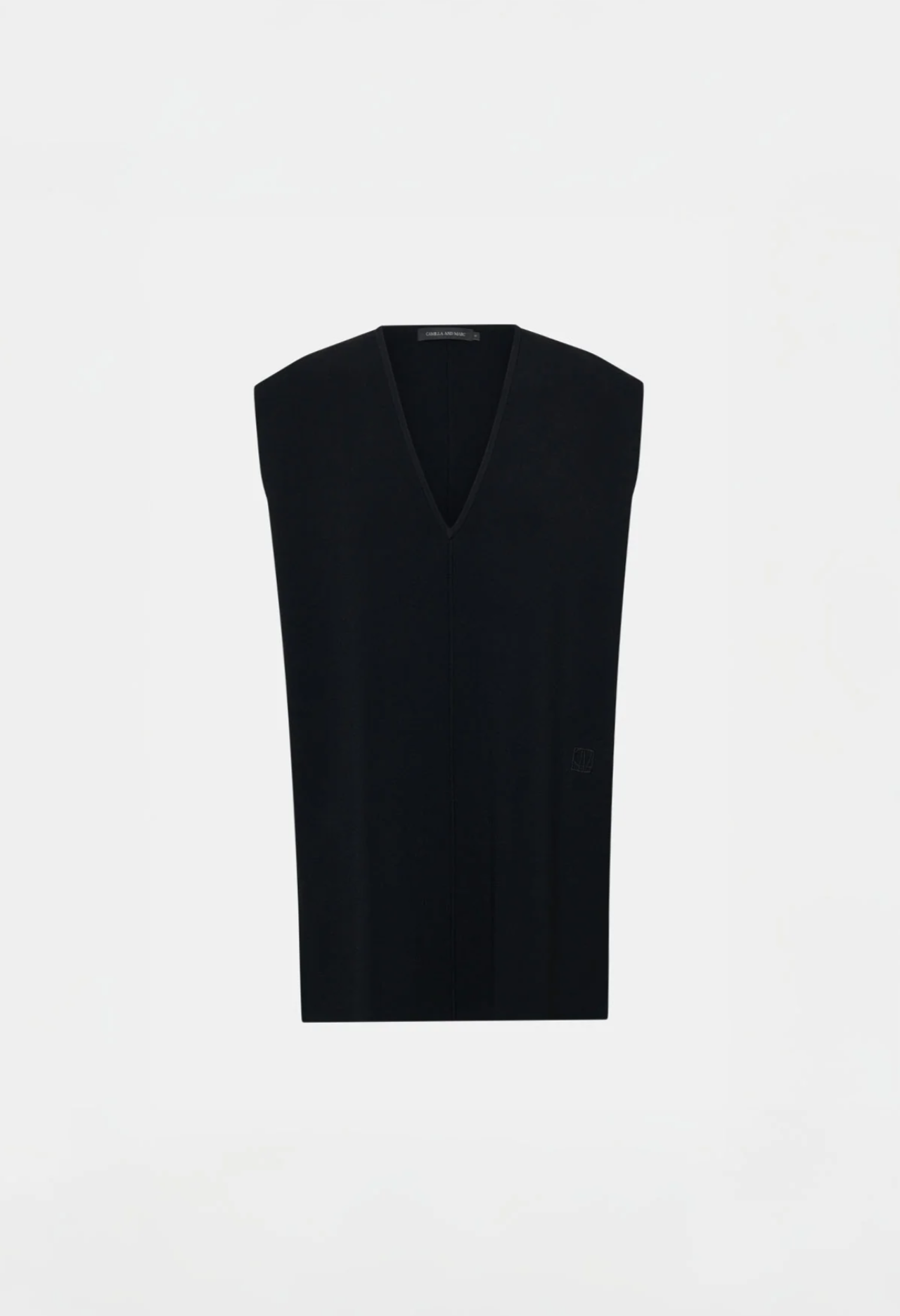 CAMILLA AND MARC Donatello oversized V-neck knit vest in black. Double faced knit with contrast internals. Embroidered monogram and side splits.