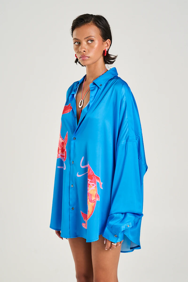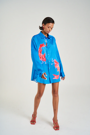 The LS Oversized Shirt featuring the hand-painted Yin Yang Koi on vibrant blue. Expertly crafted offering a silky relaxed fit with oversized cuffed sleeves.