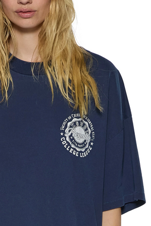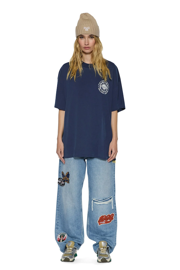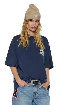 The Stacks Boyfriend Ss Tee Ink Blue is a boxy oversized short sleeve tee made from heavy weight cotton jersey in an overdyed Ink Blue with aged wash. It's detailed with a raw cut hem, overlocked side seams, varsity logo branding and signature T-box embroidery.