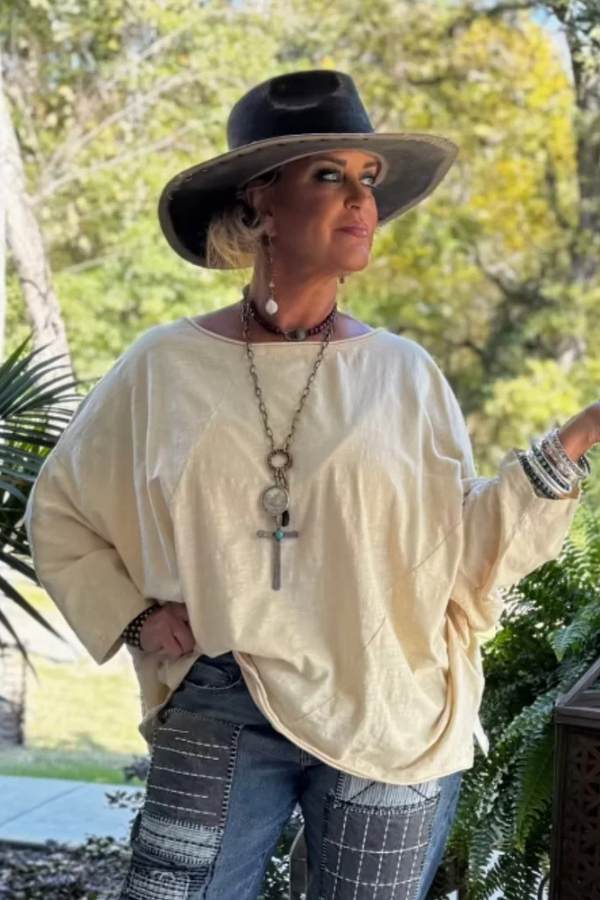 Embrace effortless bohemian style with the Jaded Gypsy Be Free Top in a versatile Oatmeal hue. Crafted from premium 100% breathable cotton, this oversized top is designed for the woman who values both comfort and a free-spirited aesthetic. One Size