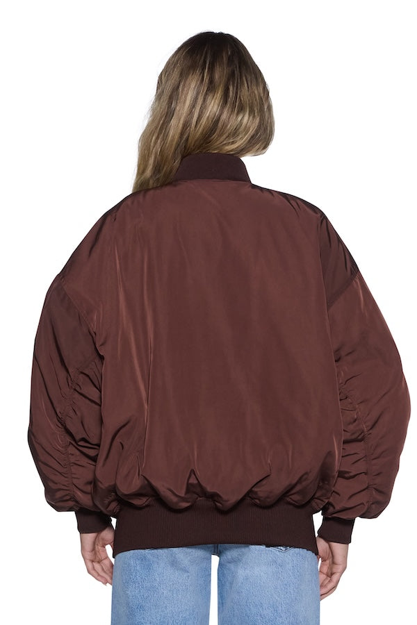 - Oversized bomber jacket, reversible, quilted lining, sleeve ruching, elastic rib hem and cuff, flap pockets, regular length