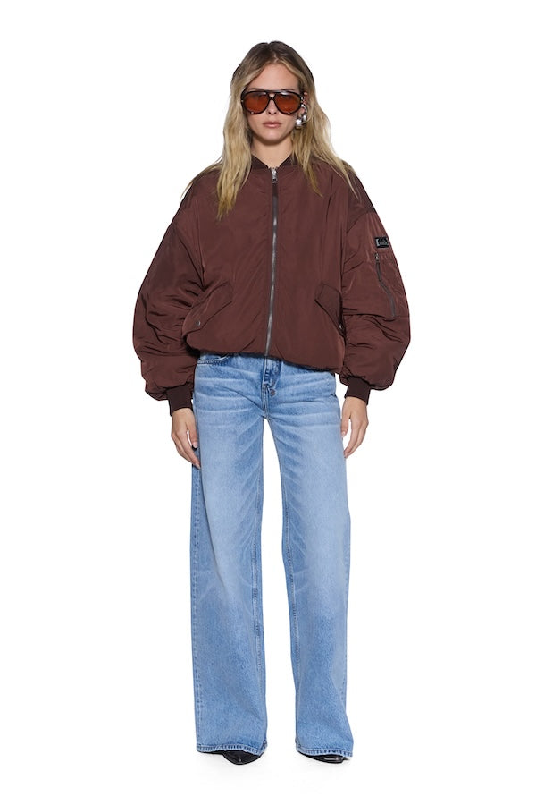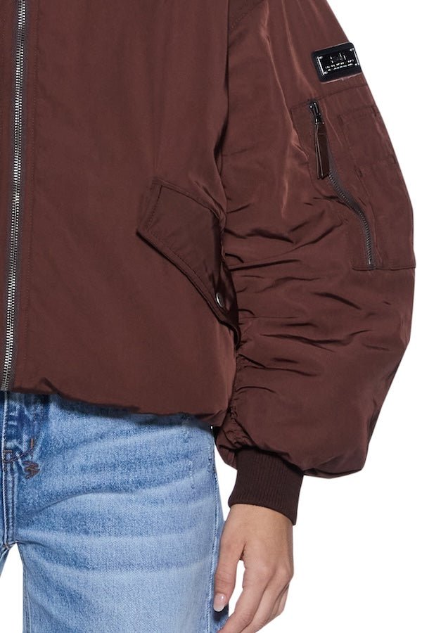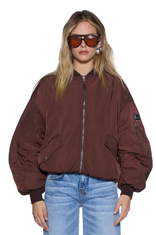 The Pilot Bomber Chocolate is an oversized, reversible pilot bomber jacket made from premium spray nylon in a seasonal chocolate brown. Featuring a quilted interior, sleeve ruching, ribbed neck, hem and cuffs, utility-inspired flap pockets, a zip pocket on the sleeve, Ksubi-branded hardware, a luxe metal plate on the outer sleeve, and a metal press plate on the internal welt pocket, it is finished with signature T-box and 3x4 embroidery.