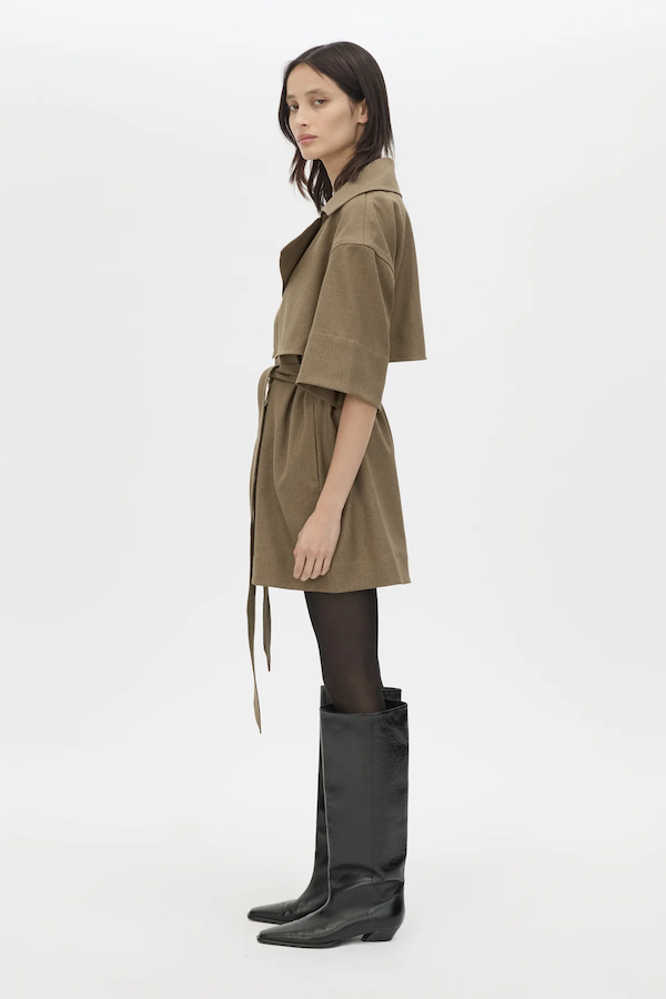 CAMILLA AND MARC Sander mini short-sleeve trench dress in sable marle. Inseam pockets, elbow length sleeves, waist belt. Trench-style lapel and storm flaps.